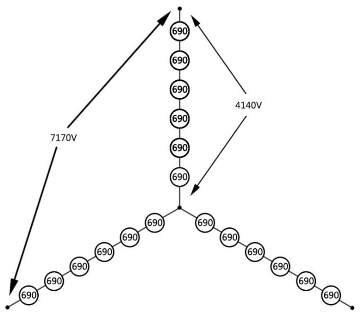 VFPS系列岸電電源系統(tǒng)采用功率單元串聯(lián)的形式,電壓疊加的原理類似于“電池組疊加”技術(shù)。當(dāng)需要6.6kV輸出時(shí),每相串聯(lián)6個(gè)功率單元,每個(gè)功率單元輸出的交流有效值為634V,相電壓3810V,線電壓6600V。每個(gè)單元最高可以輸出690V,系統(tǒng)最高可以輸出7170V。