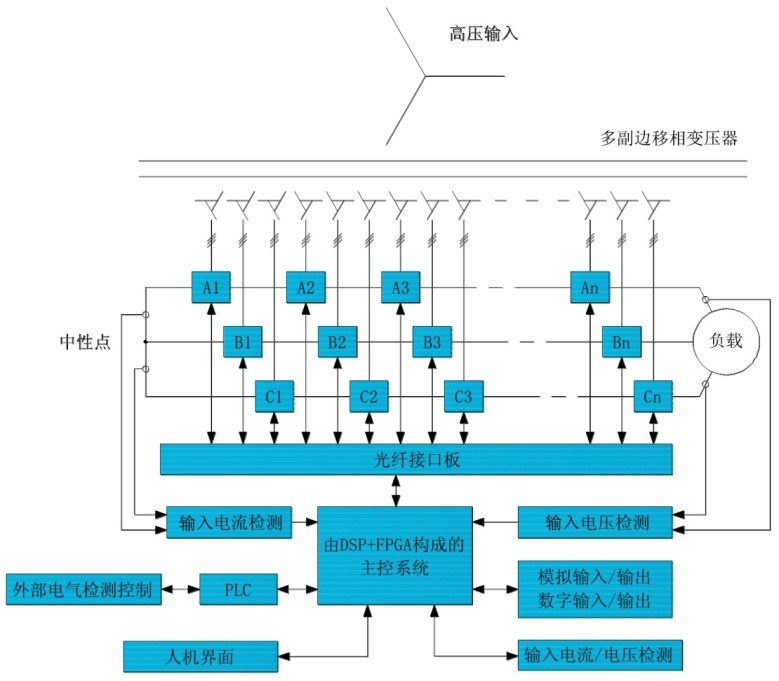 VFPS系列岸電電源系統(tǒng)由18個(gè)功率單元構(gòu)成,每6個(gè)單元串聯(lián)構(gòu)成一相,移相變壓器輸入側(cè)為36脈沖整流,輸出線電壓滿調(diào)制25電平,輸出側(cè)三相構(gòu)成Y型接法,直接給船用系統(tǒng)供電。