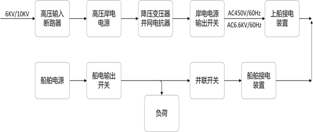 系統(tǒng)通過(guò)岸邊接電箱及柔性電纜將電源送至船舶接電裝置。最后通過(guò)船上的并網(wǎng)裝置實(shí)現(xiàn)與船舶輔機(jī)的并網(wǎng),接入船用電系統(tǒng)供全船設(shè)備使用。當(dāng)并網(wǎng)成功后,船舶輔機(jī)與岸電電源將自動(dòng)實(shí)現(xiàn)負(fù)載轉(zhuǎn)移,最終船舶輔機(jī)停運(yùn)、船用電氣設(shè)備完全由岸電電源供電。