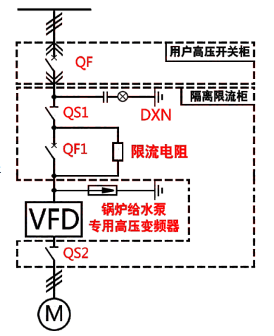 此方案為一拖一的典型方案,QS1、QS2為隔離開關(guān)。系統(tǒng)高壓上電時(shí),電流首先通過限流電阻對(duì)系統(tǒng)進(jìn)行充電,當(dāng)系統(tǒng)充電完畢后斷路器QF1自動(dòng)動(dòng)作,切除限流電阻,系統(tǒng)正常上電,整個(gè)高壓上電過程對(duì)系統(tǒng)無沖擊,有效的提高了設(shè)備使用的穩(wěn)定性及設(shè)備的使用壽命。