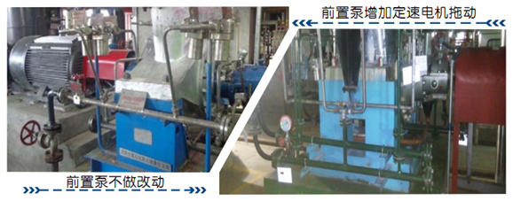 l 保留原有運(yùn)行方式,前置泵不做改動(dòng)。該方案改造后前置泵變速運(yùn)行,工程施工量小,無需新增驅(qū)動(dòng)電機(jī),節(jié)能量較增加驅(qū)動(dòng)電機(jī)的方案更大。
