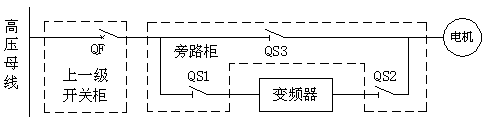 3、QS1、QS2閉合時(shí),QS3斷開(kāi)時(shí),QF閉合時(shí),電機(jī)由變頻器控制調(diào)速運(yùn)行。QS1斷開(kāi)、QS2斷開(kāi)、QS3閉合時(shí),電機(jī)可由QF直接啟停并進(jìn)行保護(hù),變頻器可完全和電網(wǎng)脫離,便于維護(hù)與檢修。
