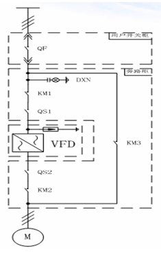 合KM3、分KM1、KM2、為工頻模式。電機可由QF直接啟停并進行保護,變頻器可完全和電網(wǎng)脫離。