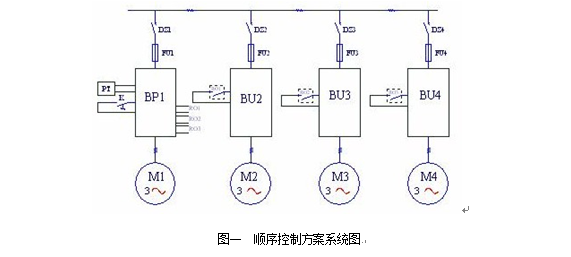 由于城市自來水的用量隨季節(jié)的變化而變化,隨每日時段不同而變化。為使供水的水壓恒定,最常見的辦法是采用變頻恒壓供水系統(tǒng),即壓力變送器裝在主管網(wǎng)上檢測管網(wǎng)壓力信號,再將此壓力信號送到變頻器(PLC)的模擬信號輸入端口,由此構(gòu)成壓力閉環(huán)控制系統(tǒng),管網(wǎng)壓力的恒定依賴變頻器的調(diào)節(jié)控制。對于多泵情況,可以兩種不同的控制系統(tǒng)方案,一種是“順序控制方案”,系統(tǒng)圖如圖一所示: