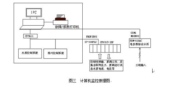 為保證系統(tǒng)的可靠性,上位機PC用于管理,用組態(tài)軟件做出若干工藝流程圖,實時顯示系統(tǒng)的運行狀況,并統(tǒng)計歷史數(shù)據(jù),如需要可隨時打印報表;還用于故障的報警和處理。PC機為研華工業(yè)計算機,PLC為西門子S-7300,便于與總控室計算機聯(lián)網(wǎng),采用帶有PROFIBUS接口的CPU315。CP5611是通信模塊,PDM-820AC電參數(shù)綜合分析儀用于檢測系統(tǒng)的用電量??刂扑玫钠?停,切換,閥的啟/閉;電機電流,溫度的檢測,水泵使用時間的統(tǒng)計;壓力,流量,水質(zhì)參數(shù)的采集等,均由PLC完成。水壓的給定值由變頻器鍵盤設定。