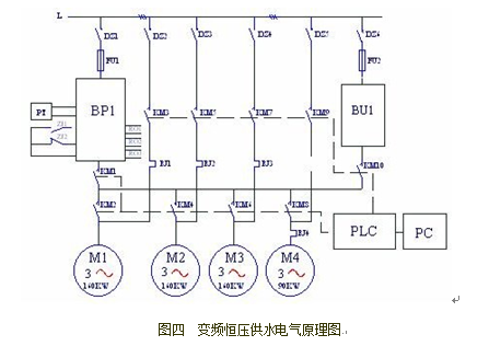 四川遂寧市自來水二廠,供水能力6萬噸/日,城市管網(wǎng)壓力0.4MPa,泵組為3臺160kW,1臺90kW水泵,要求恒壓供水并采用計算機監(jiān)控,變頻器或控制系統(tǒng)故障可由軟起動器手動起動各泵。