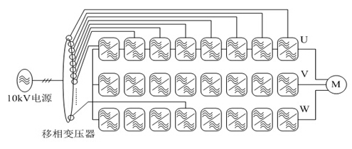 SBH系列高壓變頻器采取的拓?fù)浣Y(jié)構(gòu)方式為單元串聯(lián)型高壓變頻器,其為直接高-高變換電壓源型,變頻器基本原理如下圖2所示: