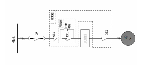 送水泵變頻改造系統(tǒng)包括三部分:隔離柜、限流柜、高壓變頻器。其中隔離柜由兩個(gè)隔離開(kāi)關(guān)組成,當(dāng)變頻器處于檢修和維護(hù)狀態(tài)時(shí),通過(guò)手動(dòng)操作分?jǐn)郠S1,QS2開(kāi)關(guān),確保檢修過(guò)程的安全性。當(dāng)需要對(duì)電機(jī)進(jìn)行絕緣耐壓試驗(yàn)時(shí),需要將QS2分?jǐn)?,試?yàn)完畢,再手動(dòng)將QS2合閘。