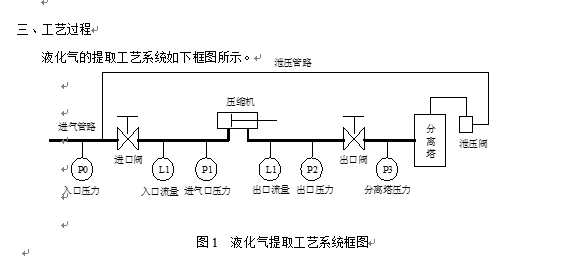 煉油產(chǎn)生的氣體,經(jīng)過壓縮機(jī)加壓后凝為液態(tài)進(jìn)入分離塔,經(jīng)過吸收等其他加工工藝,提取出石油液化氣。進(jìn)氣口壓力P1要求小于0.6MPa,壓縮機(jī)出口壓力P2可達(dá)到1.2MPa~1.7MPa之間,經(jīng)出口閥調(diào)節(jié)后保證分離塔壓力P3在1.05MPa。如果某種原因使分離塔壓力升高,為安全起見則泄壓閥打開,將分離塔內(nèi)液體經(jīng)管道回流進(jìn)氣口。