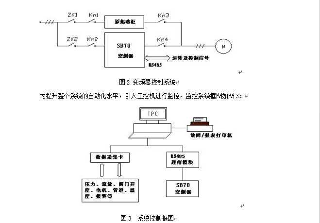 模擬量數(shù)據(jù)采集卡將壓力、流量、閥門開度、電機(jī)溫度和管道溫度等模擬信號轉(zhuǎn)換成12位的數(shù)字信號,每一路信號占用數(shù)據(jù)采集卡上一個模擬通道,互不影響,采樣周期為300ms。SB70變頻器支持RS485半雙工串行通訊方式,通過在工控機(jī)上用IP函數(shù)或VB的MSCDMM通訊控件編制串行通訊程序,即可實(shí)現(xiàn)工控機(jī)與變頻器之間的通訊,本系統(tǒng)用VB的通訊控件編制。將采集到的數(shù)據(jù)信號,經(jīng)實(shí)時分析處理后,通過組態(tài)王監(jiān)控畫面,監(jiān)測現(xiàn)場傳輸?shù)膶?shí)時數(shù)據(jù)和歷史數(shù)據(jù)及設(shè)備的運(yùn)行狀況、歷史曲線的分析、實(shí)時報(bào)表、歷史報(bào)表的打印、聲光報(bào)警等。