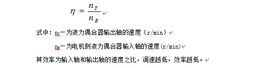 液力偶合器是通過控制工作腔內(nèi)工作油液的動量矩變化,來傳遞電動機能量,電動機通過液力偶合器的輸入軸拖動其主動工作輪,對工作油進行加速,被加速的工作油再帶動液力偶合器的從動工作渦輪,把能量傳遞到輸出軸和負載。液力偶合器有調(diào)速型和限矩型之分,前者用于電氣傳動的調(diào)速,后者用于電機的起動。調(diào)速型液力偶合器效率最大值為95%。液力偶合器的效率計算的公式為: