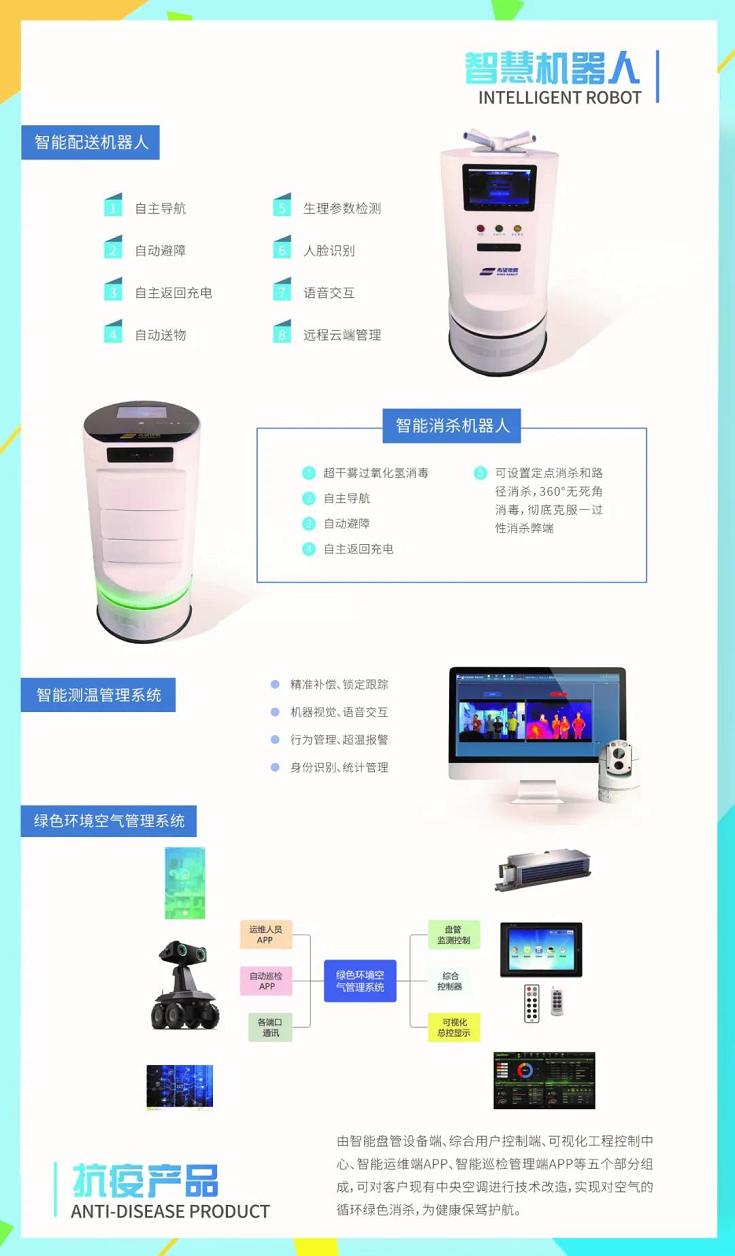 機(jī)器人產(chǎn)品是解決方案中最具智能化的高科技產(chǎn)品,憑借集團(tuán)長期的智能制造技術(shù)沉淀,推出智慧測溫機(jī)器人、智慧巡檢防疫機(jī)器人、智慧配送機(jī)器人等系列,還可實(shí)現(xiàn)與空調(diào)N95的AI智能聯(lián)動。