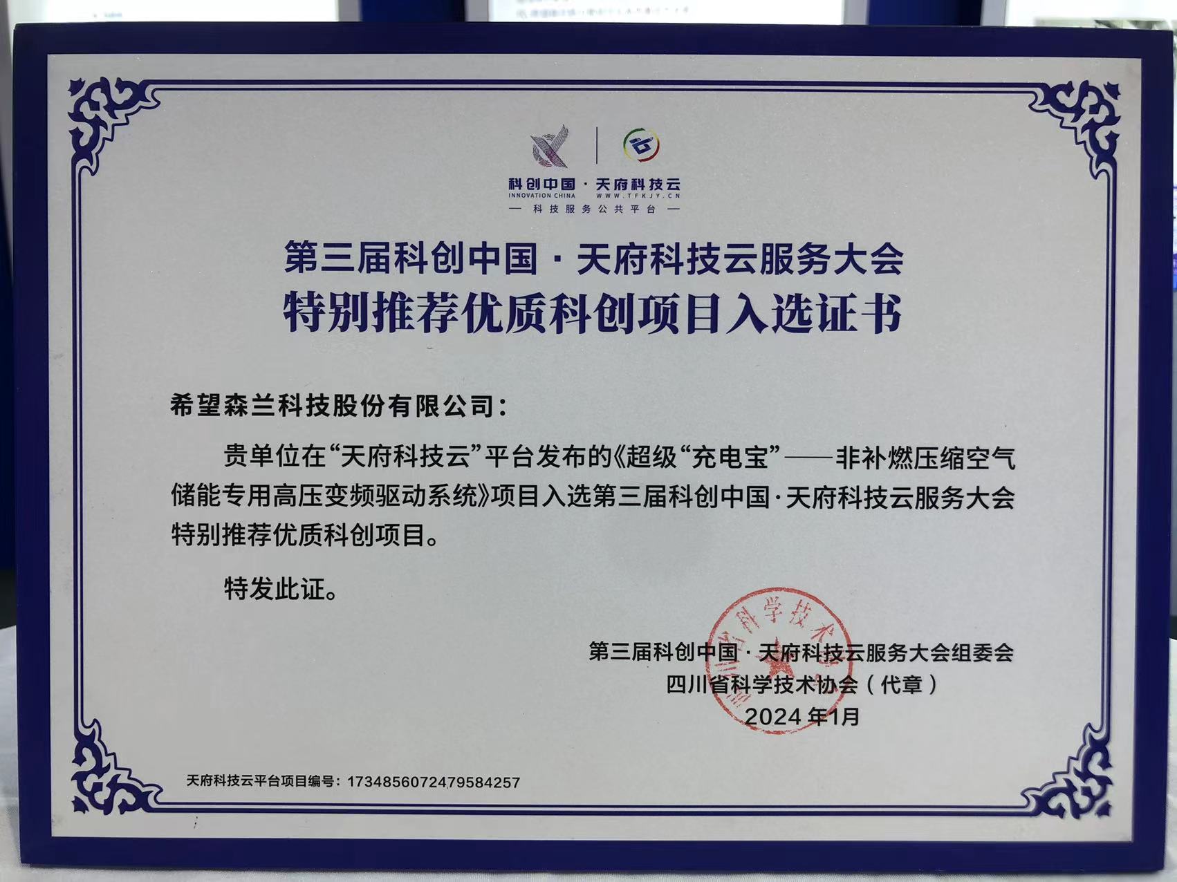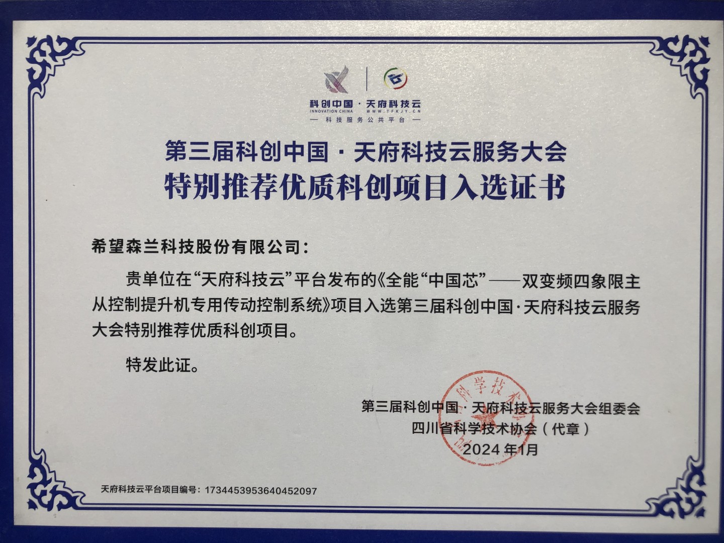 本屆大會面向大院大所大企業(yè)等征集到科創(chuàng)項目8700個,希望森蘭科技股份有限公司作為國內(nèi)專業(yè)從事傳動控制技術(shù)研究的領(lǐng)軍企業(yè),憑借硬核解決方案成功吸引了大會的關(guān)注。不僅被選為本屆重大高新技術(shù)待推廣項目,還榮獲了“特別推薦優(yōu)質(zhì)科創(chuàng)項目”獎項。