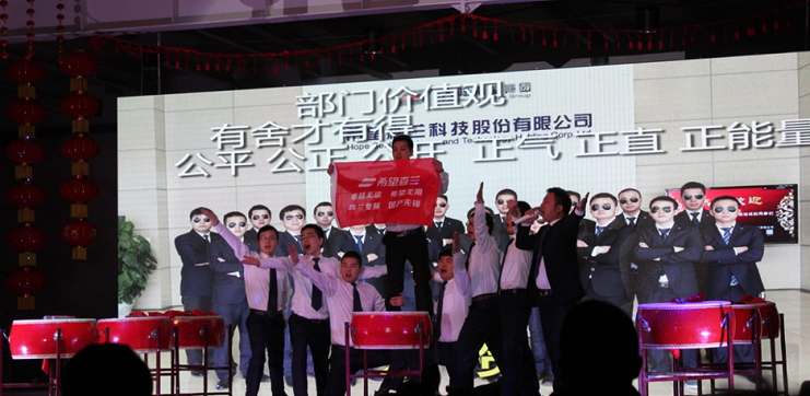 詩朗誦《沁園春·雪》配合書法“俱往矣,數(shù)風流人物,還看今朝?!贝髿獍蹴纾荣澝懒俗鎳胶拥男蹅ザ鄫?,又抒發(fā)了希望森蘭以“變”贏未來的抱負。邊跳邊唱的《七月火把節(jié)》歌調(diào)熱情豐富,滲透著一種“狂歡化”的團結(jié)精神,傳達著森蘭人積極向上的思想觀念和素樸的生活態(tài)度??偨?jīng)理及高管合唱《壯志在我胸》,管那山高水也深,也不能阻擋我奔前程,為破局2017積蓄能量。